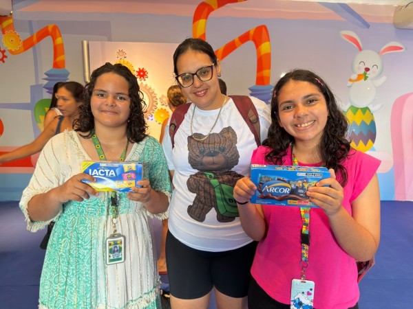 Vinícius Medeiros participou com o irmão Davith Guilherme e a mãe, Raiane Patrício, e saiu satisfeito com o que encontrouAs irmãs Emanuela Lima, de 14 anos, e Kethellen Mayara, de 13, chegaram acompanhadas da mãe, a dona de casa Jéssica Nascimento, cheias de expectativa para viver um momento especial, e saíram encantadas com a experiência. Logo na entrada da Fábrica de Chocolate, o brilho nos olhos já revelava o impacto do cenário preparado especialmente para a programação de Páscoa. “Foi muito legal, tudo muito bonitinho, achei incrível tirar fotos e ganhar caixa de chocolate”, contou Emanuela, ainda empolgada com cada detalhe do ambiente.